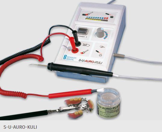 Sættet indeholder: 1 styreenhed, 1 håndstykke, 1 forgylder instrument nr. II, 1 børste-elektrode, 1 kabel og 20 ml forgyldervæske.