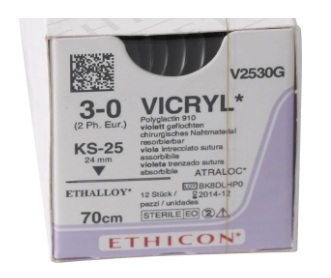 Resorberbar vicryl, 0.25 mm, 3-0, 70 cm, med rund lige KS-25 nål med skærende spids.
