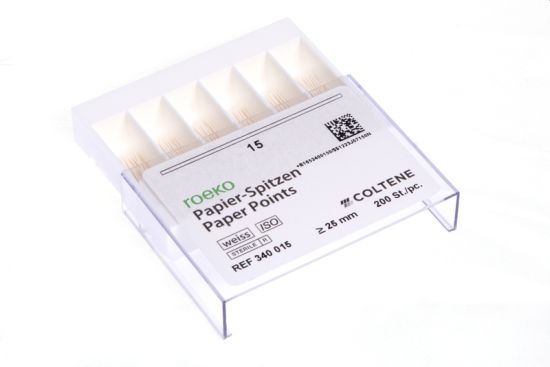 Sterile hvide paperpoints med farvemarkering i toppen.